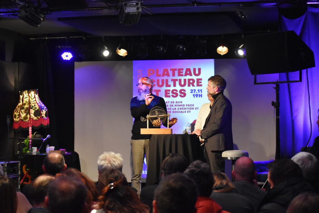 Pas question ici d’un débat figé ou d’un enchaînement de discours préparés. Le Plateau Culture & ESS a pris la forme d’un talk-show, animé par l’inimitable Alexandre Moisescot (Cie Gérard Gérard), accompagné de Solal Moulin. Avec leur sens du rythme, de l’ironie et du décalage, ils ont su installer un cadre à la fois exigeant et détendu, permettant aux échanges d’être à la fois profonds, directs et parfois franchement drôles.