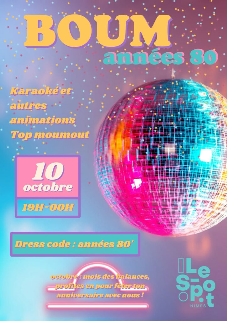 Agenda — Le Spot Accueil > Agenda > Le Spot 31 Oct 19H Le Friday 31 October 2025 à 19H ● Soirée flechettes Halloween du CrewCodiles ● • Lieu : Le Spot En savoir + 24 Oct 20H30 Le Friday 24 October 2025 à 20H30 ● Concert rock Pubjack ● • Gratuit Lieu : Le Spot En savoir + 18 Oct 18H Le Saturday 18 October 2025 à 18H ● Soirée enquête et mystères ● • Gratuit Lieu : Le Spot En savoir + 17 Oct 20H Le Friday 17 October 2025 à 20H ● Acry’Démo’Show ● • Lieu : Le Spot En savoir + Réserver 10 Oct 19H Terminé Le Friday 10 October 2025 à 19H ● Boum Année 80 ● Terminé • Gratuit Lieu : Le Spot En savoir + 3 Oct 19H30 Terminé Le Friday 3 October 2025 à 19H30 ● Lou Drac Cabaret ● Terminé • Lieu : Le Spot En savoir + 6 Sep 16H Terminé Le Saturday 6 September 2025 à 16H ● Inauguration de l’EXPO DE OUF ! #13 ● Terminé • Gratuit Lieu : Le Spot En savoir + 5 Sep 18H Terminé Le Friday 5 September 2025 à 18H ● AFTERWORK #6 – Musight au Lavoir du Puits Couchoux ● Terminé • Gratuit Lieu : Le Spot En savoir + 31 Aug 10H Terminé Le Sunday 31 August 2025 à 10H ● Balade de OUF à vélo – Agglo ● Terminé • Lieu : Le Spot En savoir + 30 Aug 10H Terminé Le Saturday 30 August 2025 à 10H ● Balade de OUF à vélo – Gambetta/Richelieu ● Terminé • Gratuit Lieu : Le Spot En savoir + 27 Aug 10H Terminé Le Wednesday 27 August 2025 à 10H ● Atelier collage avec Perrine Griselin ● Terminé • Gratuit Lieu : Le Spot En savoir + Jusqu'au 20 Dec En cours Jusqu'au Saturday 20 December 2025 EXPO DE OUF ! #13 En cours • Gratuit Lieu : Le Spot En savoir + 17 Jul 18H Terminé Le Thursday 17 July 2025 à 18H ● Apéro bénévole de ouf ! #2 ● Terminé • Gratuit Lieu : Le Spot En savoir + 27 Jun 20H30 Terminé Le Friday 27 June 2025 à 20H30 ● Spectacle d’impro avec les Mytho-Kondriak ● Terminé • Lieu : Le Spot En savoir + 27 Jun 16H Terminé Le Friday 27 June 2025 à 16H ● BELLES JOURNÉES – Le Spot rejoint le OFF du festival Beau Week-end ● Terminé • Gratuit Lieu : Le Spot En savoir + 26 Jun 19H Terminé Le Thursday 26 June 2025 à 19H ● Soirée Cult : Les Anneaux de Pouvoir dans l’œil des experts ● Terminé • Gratuit Lieu : Le Spot En savoir + 21 Jun 17H Terminé Le Saturday 21 June 2025 à 17H ● Fête de la BASS Musique ● Terminé • Gratuit Lieu : Le Spot En savoir + 20 Jun 19H Terminé Le Friday 20 June 2025 à 19H ● Soirée fléchettes avec le Crew-kodiles ● Terminé • Gratuit Lieu : Le Spot En savoir + 20 Jun 18H Terminé Le Friday 20 June 2025 à 18H ● Apéro bénévole de ouf ! ● Terminé • Gratuit Lieu : Le Spot En savoir + 14 Jun 20H Terminé Le Saturday 14 June 2025 à 20H ● Spectacle de fin d’année – Acrylik’ Impro ● Terminé • Lieu : Le Spot En savoir + 13 Jun 20H Terminé Le Friday 13 June 2025 à 20H ● Spectacle de fin d’année – Acrylik’ Impro enfants ● Terminé • Lieu : Le Spot En savoir + Jusqu'au 7 Jun Terminé Jusqu'au Saturday 7 June 2025 ● La Rayvox Feria Party ● Terminé • Gratuit Lieu : Le Spot En savoir + 23 May 19H30 Terminé Le Friday 23 May 2025 à 19H30 ● L’Arène des Drags “LA FINALE” ● Terminé • Lieu : Le Spot En savoir + Jusqu'au 18 May Terminé Jusqu'au Sunday 18 May 2025 ● OVNI – Objets vivants nouveaux imaginaires ● Terminé • Lieu : Le Spot En savoir + 16 May 20H30 Terminé Le Friday 16 May 2025 à 20H30 ● Spectacle d’impro avec Acrylik Impro ● Terminé • Spectacle Vivant, Impro Lieu : Le Spot En savoir + 10 May 14H Terminé Le Saturday 10 May 2025 à 14H ● Bourse aux Livres – asso aux notes buissonnières ● Terminé • Gratuit L'association Le Spot Marché Lieu : Le Spot En savoir + 9 May 19H Terminé Le Friday 9 May 2025 à 19H ● SOIREE DISCO ● Terminé • Gratuit L'association Le Spot Lieu : Le Spot En savoir + 18 Apr 19H Terminé Le Friday 18 April 2025 à 19H ● SOIREE FLECHETTES AVEC LE CREW-KODILE ● Terminé • Lieu : Le Spot En savoir + 11 Apr 20H Terminé Le Friday 11 April 2025 à 20H ● MATCH D’IMPRO – ACCRO’NIMES VS IMPROXIMATIF’S ● Terminé • Lieu : Le Spot En savoir + 21 Mar 19H Terminé Le Friday 21 March 2025 à 19H ● SOIREE FLÉCHETTES ● Terminé • Gratuit Lieu : Le Spot En savoir + 14 Mar 20H Terminé Le Friday 14 March 2025 à 20H ● LES EXPERTS A MYHTOLAND ● Terminé • Lieu : Le Spot En savoir + 8 Mar 18H Terminé Le Saturday 8 March 2025 à 18H ● ELLES IMPROVISENT● Terminé • Lieu : Le Spot En savoir + 7 Mar 19H Terminé Le Friday 7 March 2025 à 19H ● APOLO + THE DAWN + JUSTIN PEUHDAMOUR ● Terminé • Lieu : Le Spot En savoir + 14 Feb 20H Terminé Le Friday 14 February 2025 à 20H ● Spectacle d’impro avec Acrylik● Terminé • Lieu : Le Spot En savoir + 9 Feb 11H Terminé Le Sunday 9 February 2025 à 11H ● NOPATHOS ● Terminé • Lieu : Le Spot En savoir + 8 Feb 18H Terminé Le Saturday 8 February 2025 à 18H ● Soirée Musight Club ● Terminé • Gratuit Lieu : Le Spot En savoir +